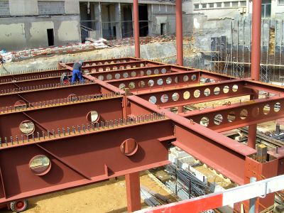 Tekst: <p>BP3 est un immeuble de bureaux dans le cœur financier de Londres, sur Canary Wharf. Il est constitué de trois modules et construit selon un plan que l’on retrouve dans de nombreux immeubles de bureaux londoniens : un noyau en béton entouré d’une structure en acier. La structure en acier abrite les bureaux du bâtiment ; elle est ancrée au noyau en béton au moyen de tôles en acier coulées. La structure en acier est construite de manière à obtenir une hauteur d’étage minimale et à utiliser l’espace le plus efficacement possible. Elle est constituée de poteaux reliés par des poutres horizontales. Des réservations sont prévues dans ces dernières pour le passage des équipements. Un panneautage métallique est posé sur les poutres en acier et sert de coffrage perdu tout en contribuant à la rigidité du plancher.