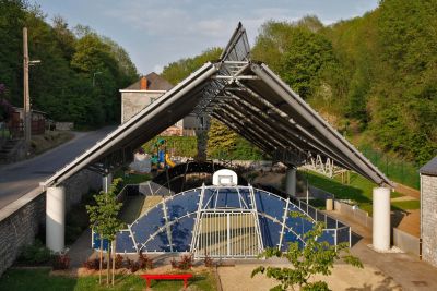 Tekst: <p>Le nouveau musée Hergé se situe à l’orée du bois de la Source et surplombe l’Anneau Central à Louvain-la-Neuve. C’est côté ouest, que se trouve l’entrée du public. Un vaste espace lumineux distribue quatre entités qui abritent une cafétéria, une boutique, une salle d’expositions temporaires, des sanitaires/ vestiaires et le poste de sécurité. Des passerelles permettent aux visiteurs de passer d’une entité à l’autre. Afin de pouvoir enjamber l’anneau central sur des portées assez considérables, il a fallu insérer des éléments porteurs verticaux les plus légers possibles pouvant donner l’impression que le volume flotte au dessus de la route dans un entourage verdoyant. Pour atteindre cet objectif, la seule possibilité était l’utilisation de l’acier en profilés reconstitués sous forme de tripodes s’élargissant comme un éventail régulier depuis leur base vers les appuis sous la dalle du musée.</p>