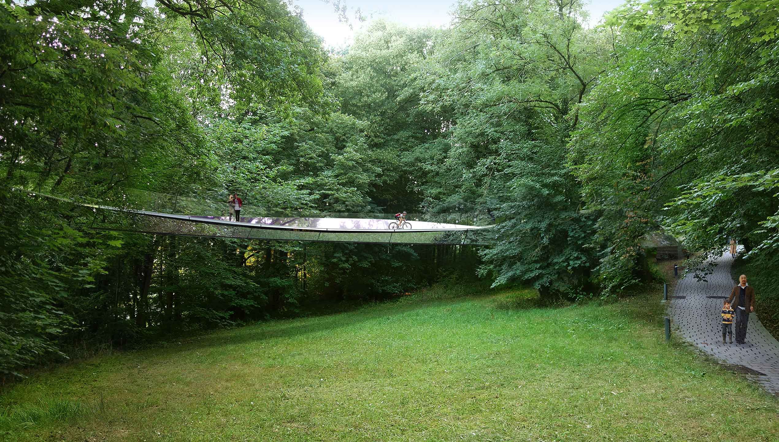 De nieuwe voetgangers- en fietsbrug in Luxemburg verbindt de hedendaagse stedelijke ontwikkeling van het Kirchberg-plateau met het Museum voor Moderne Kunst en doorkruist het Trois Glands-bos. De structuur is tussen zijn slanke steunpunten gespannen. De statische omstandigheden van de krachtswerking geven de koker van het brugdek een variabele vorm om de torsie op te nemen die samenhangt met de kromming in het vlak van het traject.