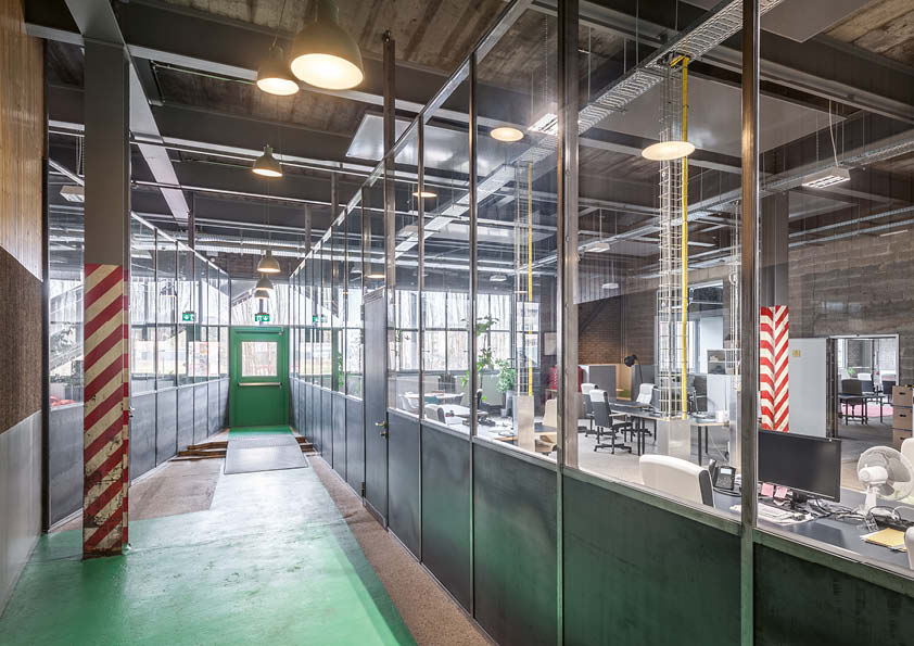 Een grote werkruimte werd in tweeën gedeeld zonder het open karakter van het geheel aan te tasten of de ruimte donkerder te maken. De wanden begrenzen de nieuwe ruimtes zonder ze akoestisch te scheiden, aangezien ze niet de volledige plafondhoogte bestrijken. Ze zijn samengesteld uit een gesloten onderste deel en een beglaasd bovenste deel, conform de afmetingen en hoogtes van de bestaande ramen van deze voormalige ARBED-ateliers. Alle profielen zijn gemaakt van onbehandeld ruwstaal, terwijl de opvulplaat uit zwart staal bestaat. De binnenzijde van de platen is bekleed met lichtgrijs vilt om de akoestiek in de werkruimtes te verbeteren. De staalconstructie is geprefabriceerd en de beglazing is in slechts drie weken tijd geplaatst, wat op de werf zelf gebeurde. Door onbehandeld ruwstaal te gebruiken en de glaslatten vast te schroeven, kunnen het glas en de staalprofielen later gemakkelijk gescheiden worden en kan de hele constructie opnieuw gebruikt worden.