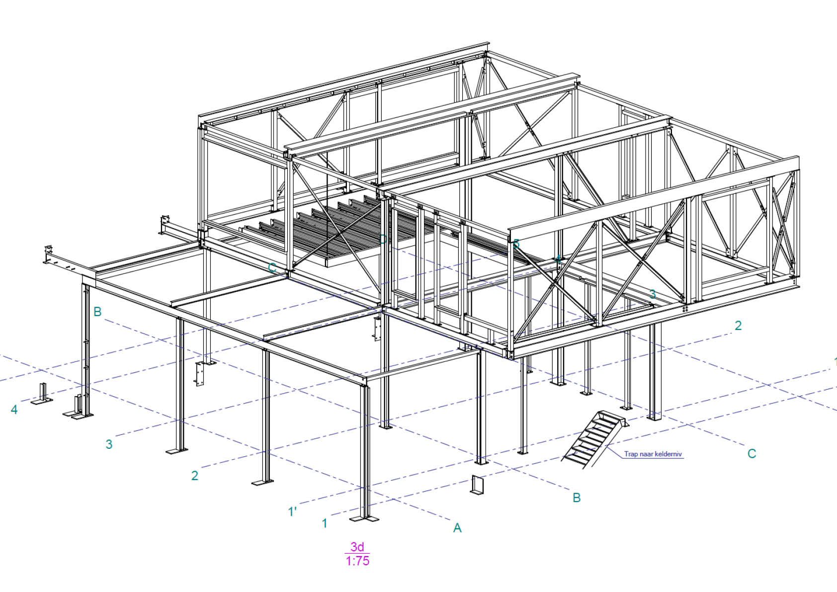 De bouwvorm van deze vrijstaande woning in het Waaslandse groen is met wat verbeelding te omschrijven als twee over elkaar geschoven blokjes, alsof ze samen een duet zingen. Twee rechtgeaarde volumes, twee identiteiten die een beeldende spanning opleveren (beton versus staal). De stalen draagstructuur – gestraald en geschilderd in lasprimer en grondverf – is opgevat als een skelet van warmgewalste profielen (circa 15 ton S235-staal).