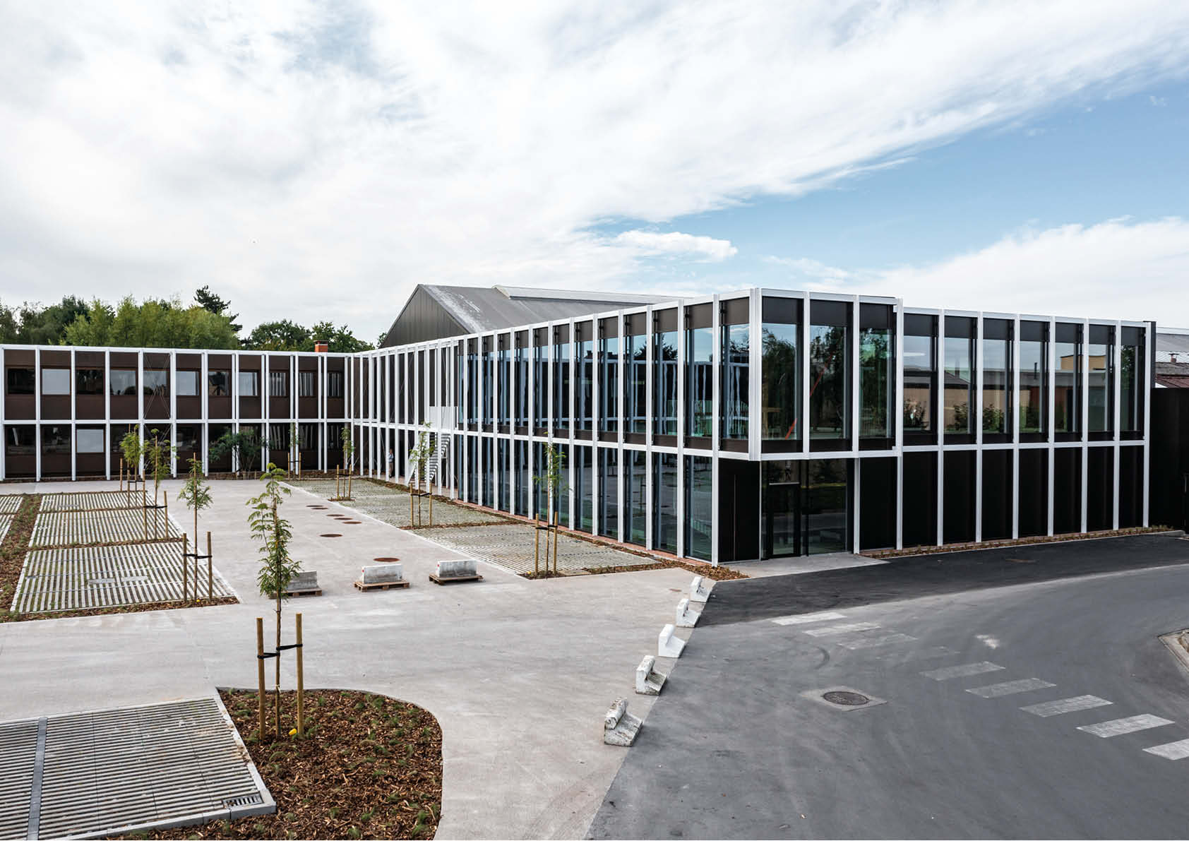 De overige structuren zijn open om zoveel mogelijk lichtinval te hebben in de kantoorgebouwen. D.m.v. inox kabelnetten is ook een fysieke afsluiting voorzien tussen de bezoekersparking en de parking voor eigen personeel.