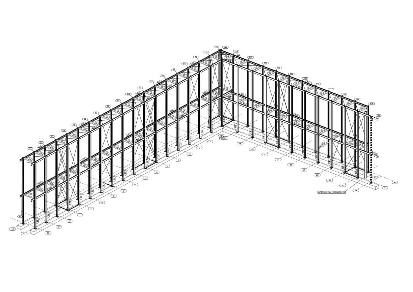 Alle profielen werden specifiek ontwikkeld voor dit project. De kolommen bestaan uit een T-sectie, de liggers zijn diverse C-profielen, waarbij voor de afmetingen en geometrie onder meer rekening gehouden werd met mogelijke waterstagnatie, onderhoud etc. Alle profielen werden voorzien van een zeer duurzame oppervlaktebehandeling: verzinkte profielen + KTL & poedercoating. De wandelgang werd m.b.v. steeldeck-beplating en EPDM-afdichting waterdicht afgewerkt.